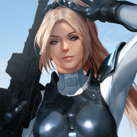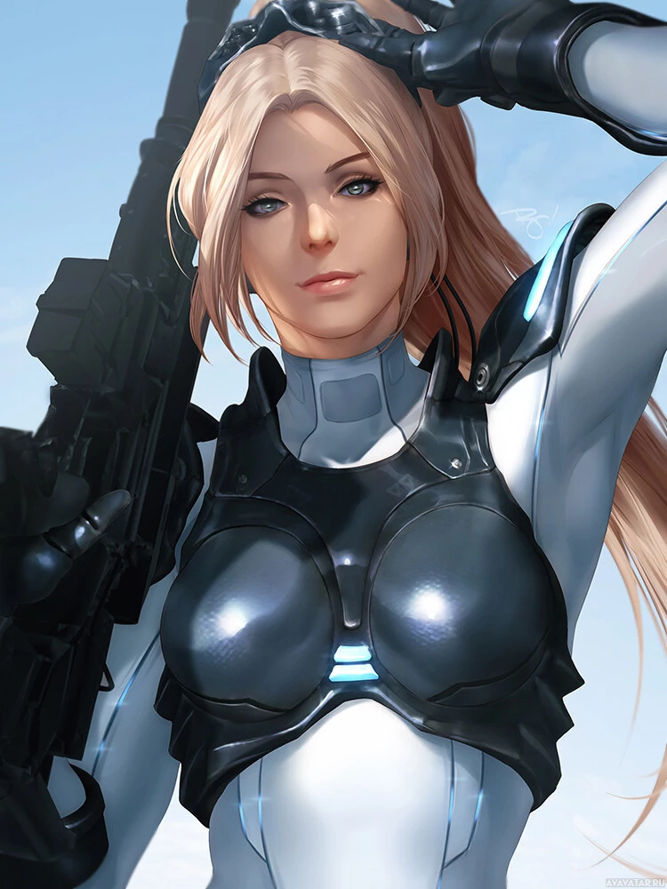 a female character with blonde hair, wearing a futuristic suit that resembles armor, often associated with video games or science fiction themes. She is holding a gun with her right hand and appears to be in