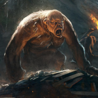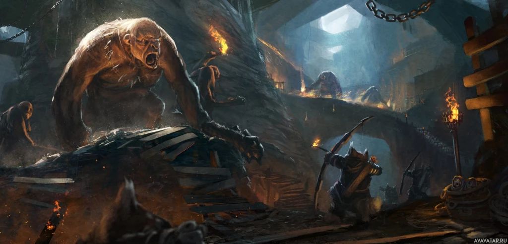 a fantasy scene with several elements that suggest it is set in a fictional universe. There's a large, menacing figure that resembles
