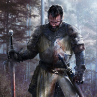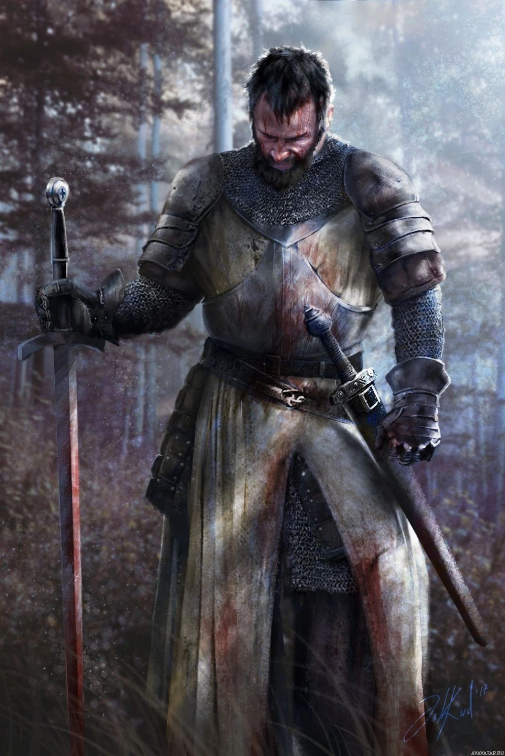 medieval armor, holding a sword. The warrior appears to be standing in what looks like a battlefield or forest with