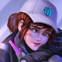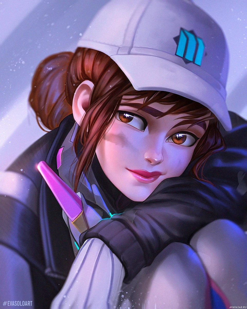 a female character, who is styled to resemble a video game character from the Overwatch game. She is wearing a white baseball cap with a blue logo on it, which corresponds to her