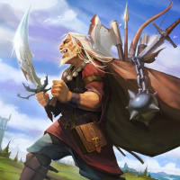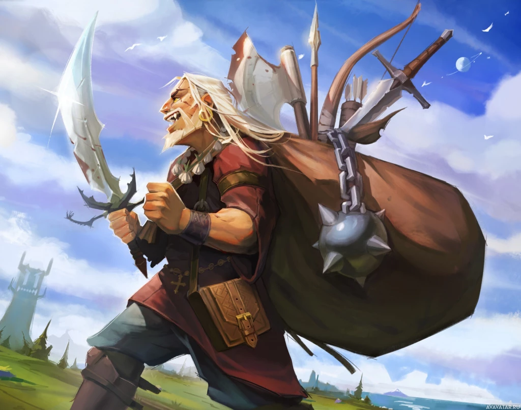 white hair and is holding a large sword in one hand and what appears to be a shield or buckler in the other. He is dressed in armor that suggests a warrior or adventurer theme, complete with a helmet, mail, and boots. The character's pose indicates