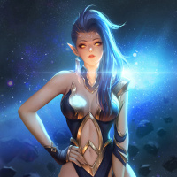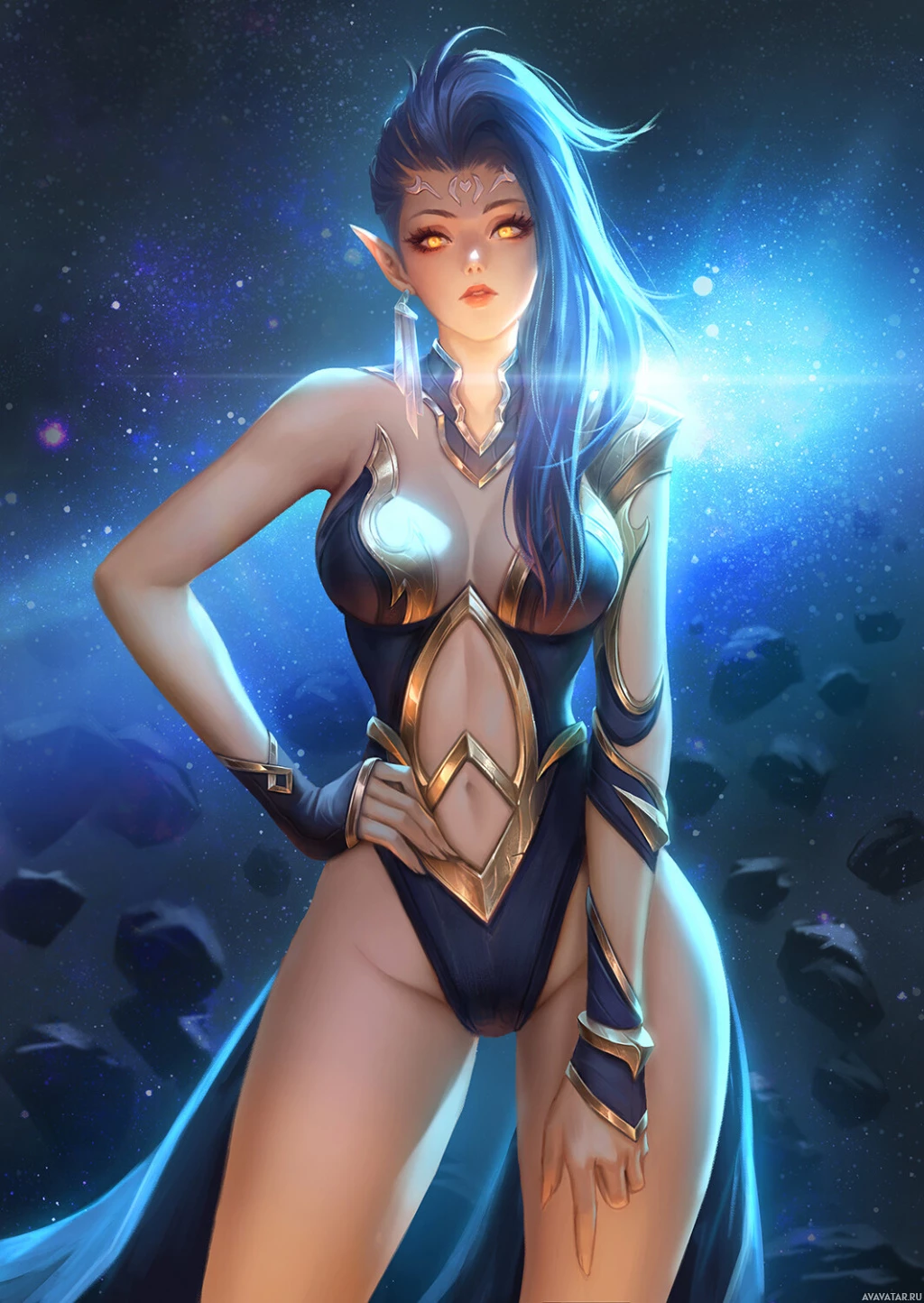 fantasy character with blue hair, dressed in an elaborate costume that suggests she could be a warrior or guardian. She is standing against a backdrop of a starry