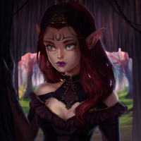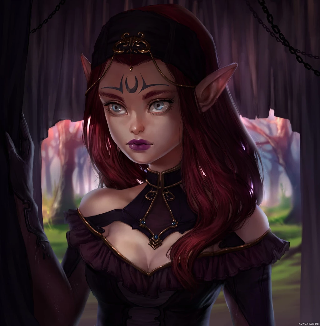 fantasy setting. She has red hair and wears elaborate clothing with dark elements and what seems to be a mystical emblem on her forehead, which is common in