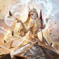 lightning bolts, and chaotic elements, suggesting she might be in the midst of battle or performing a powerful act.