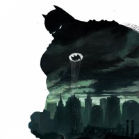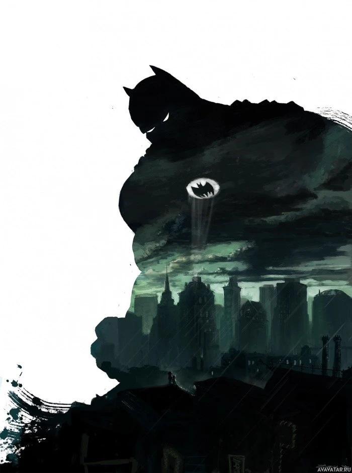 The image depicts a stylized illustration of Batman, a popular comic