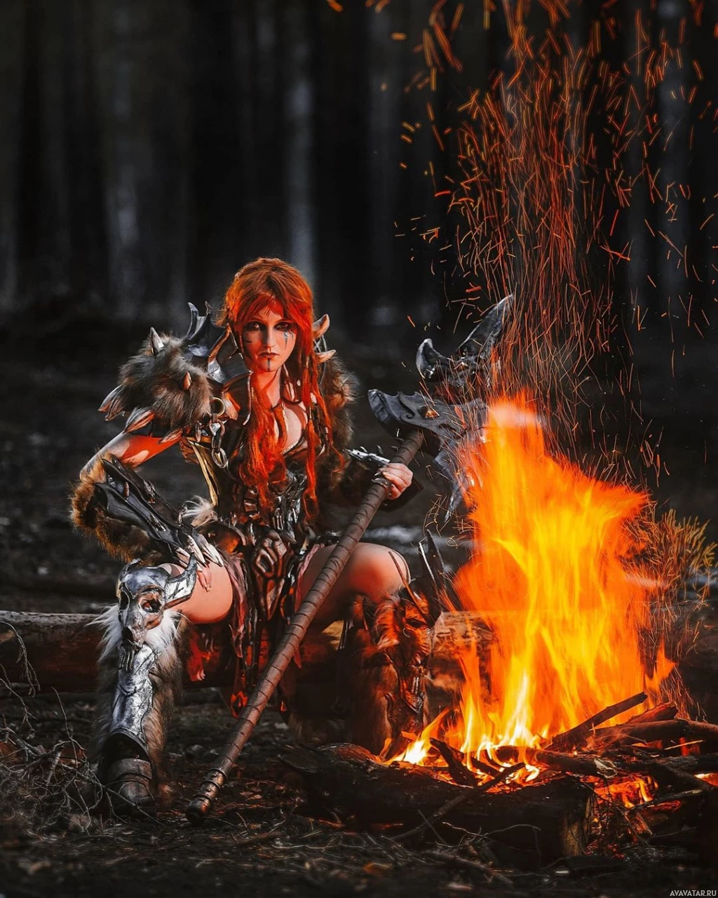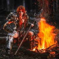 a female character with long red hair, dressed in a fantasy-themed costume that resembles a warrior or a witch from a historical or mythological setting. She is sitting on the ground beside a fire, which appears to be burning wood. Her attire includes armor pieces and what looks like fur, suggesting a role as a protector or hunter in her