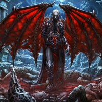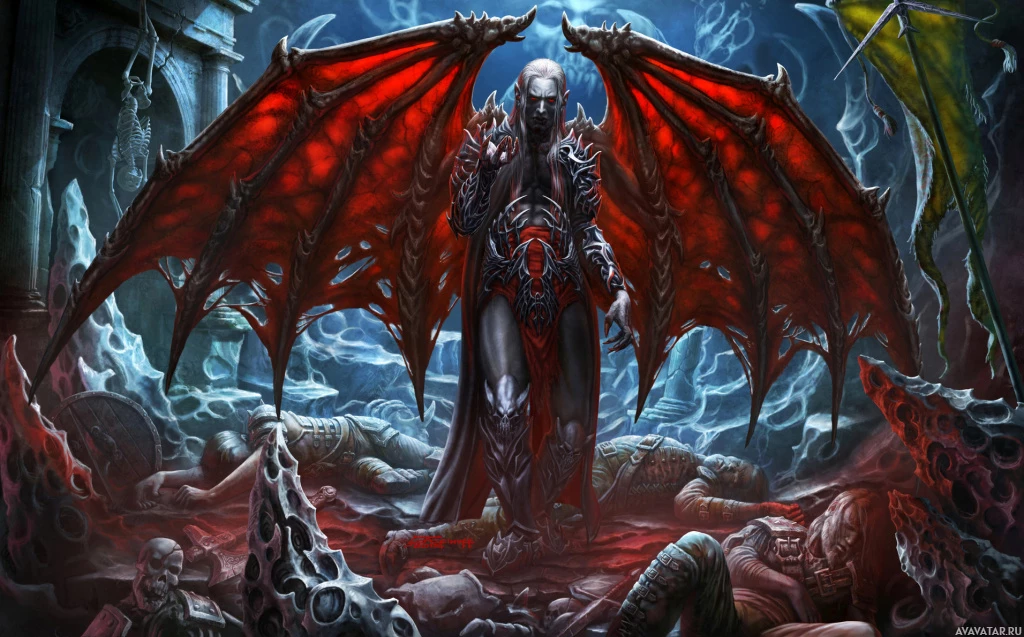 The image features a figure that appears to be a fantasy or vampire-themed character. This character is depicted with red wings and is standing on