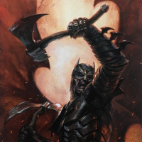 На картинке изображен персонаж Бэтмен. Он изображен с большим топором в руках, который является важным оружием в его арсенале. Художественный стиль выглядит динамичным и напряженным, что соответствует культовому персонажу комиксов, известному своими битвами со злодеями.