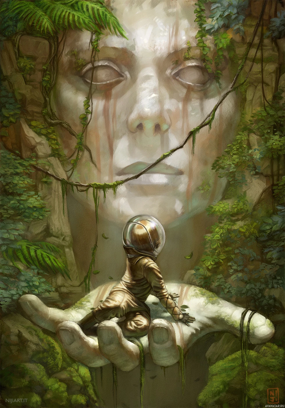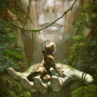 forest setting. There are elements that resemble vines or roots around the head of the statue, indicating some form of connection to nature. The color palette is muted with