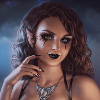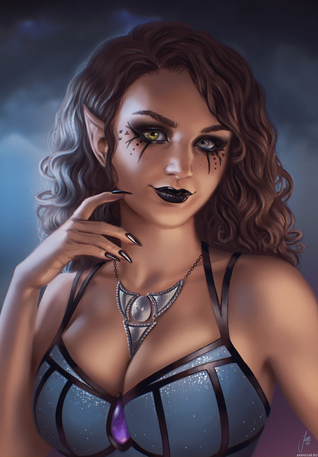 fantasy settings and is wearing makeup that enhances her otherworldly appearance. Her attire includes what seems to be a corset or bodice adorned with gems and possibly