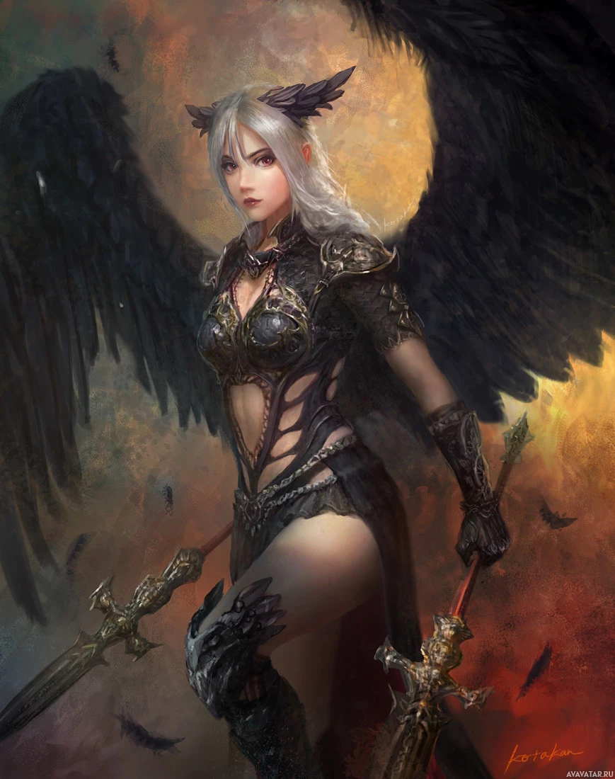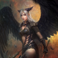 large wings, feathered costume elements, and is holding what look like magical weapons or swords. Her expression is stern and focused. The artwork style suggests it could be from