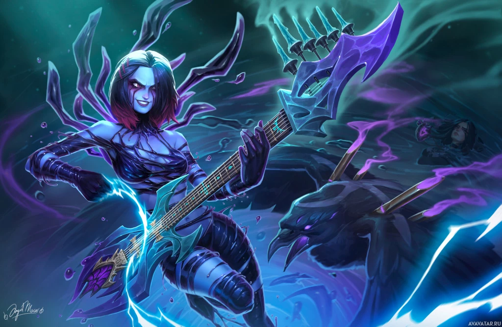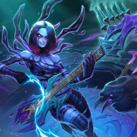 a female character playing an electric guitar. She appears to be a musician, possibly in the context of a fantasy or gaming theme, given the stylized clothing and background. The character is depicted with purple and blue hues, suggesting a mystical or magical setting. The artwork conveys a sense of action and energy, typical of fantasy music-themed scenes.
