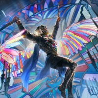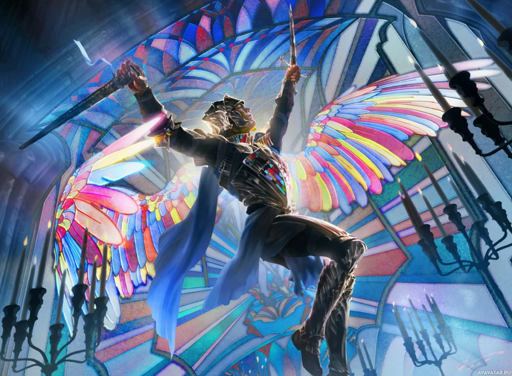 religious iconography with fantastical elements such as the wings and sword, suggesting a narrative that is both otherworldly and rich in symbolism.