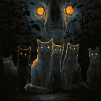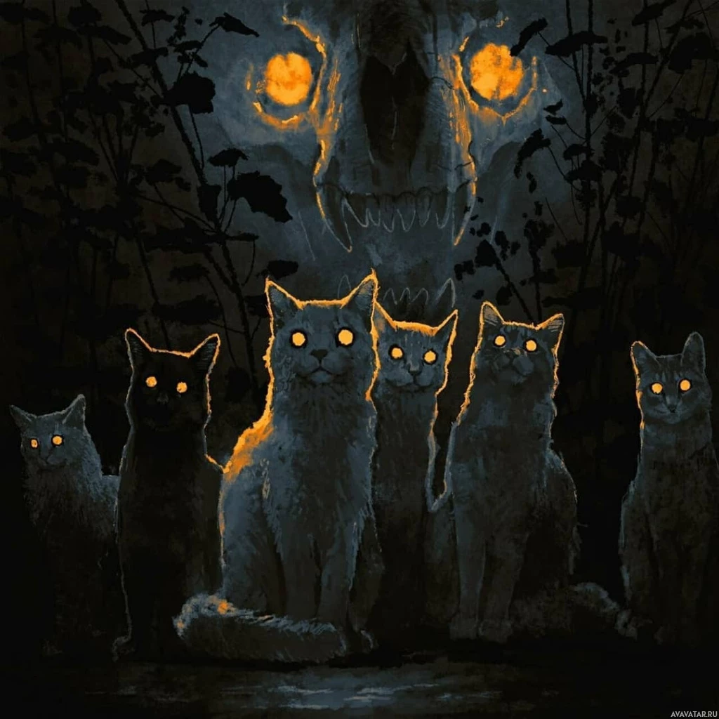 a nocturnal setting. The cats appear to have glowing eyes, adding a mysterious or magical quality to the scene. In the background, there is a large, intimidating face with