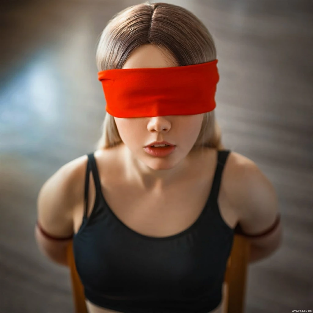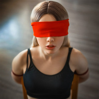 a young woman with her eyes covered by red blindfold. She appears to be seated and wearing an outfit that could be interpreted as workout or sports attire. It's a staged photograph, likely intended to evoke themes of