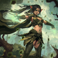 pointed ears, a tail, and features that suggest she might have some sort of magical or enchanted nature. Her attire includes what seems to be a leafy garment, possibly made of