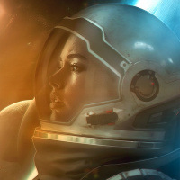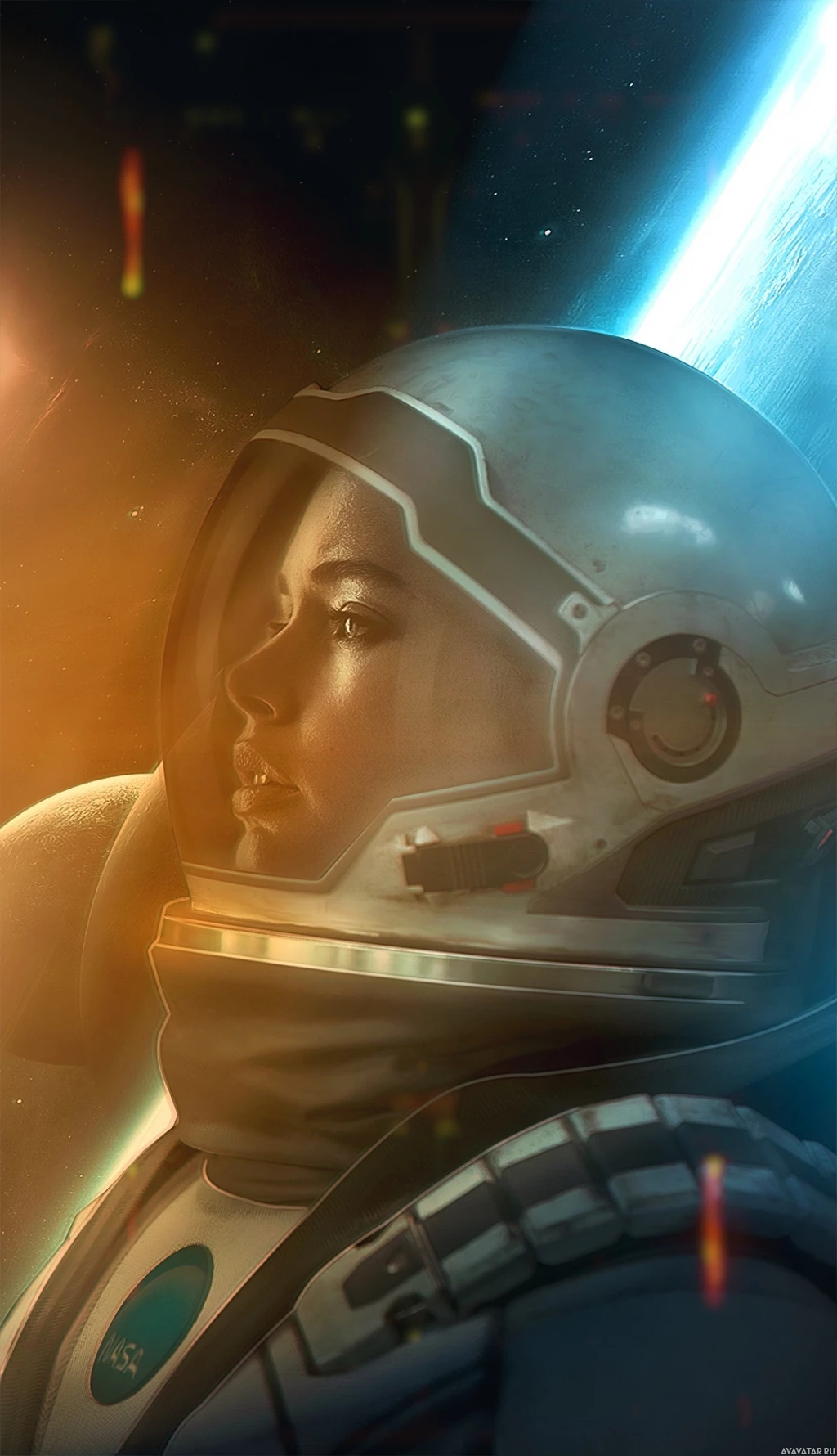 a space suit, standing in front of a backdrop that suggests they are inside a spacecraft or preparing for space travel. The character is wearing a helmet and appears to be looking out at the stars, which could symbolize exploration or discovery. The overall theme is related to space and science fiction.
