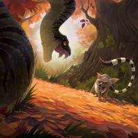 an animated scene from a story, set in what appears to be an autumn forest. There are two main characters: on the left is a snake with dark brown scales and