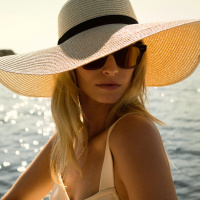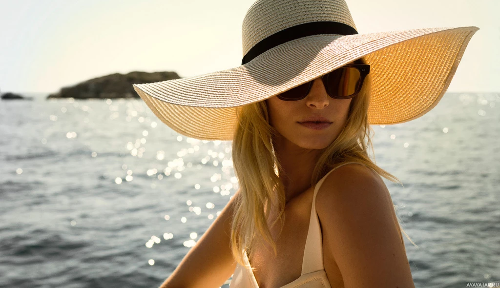 a sunny setting, possibly at a beach or on a boat. The focus of the image appears to be the woman's head and shoulders, capturing the style and elegance associated with her appearance.