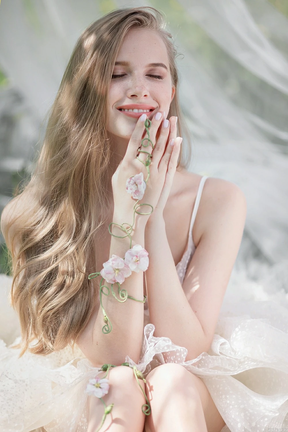 delicate flowers that may be made of fabric or real flowers. The image seems to convey a sense of elegance and dreaminess, possibly related to weddings or