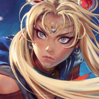 an animated character that appears to be from the Sailor Moon series. She is shown with a determined expression and her hair flowing dramatically, which is characteristic of the series' style. This character is likely Serena Tsukino, also known as Usagi Tsukino, one of