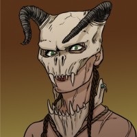 a horned helmet that resembles the masks worn by super mutants in the game. She has