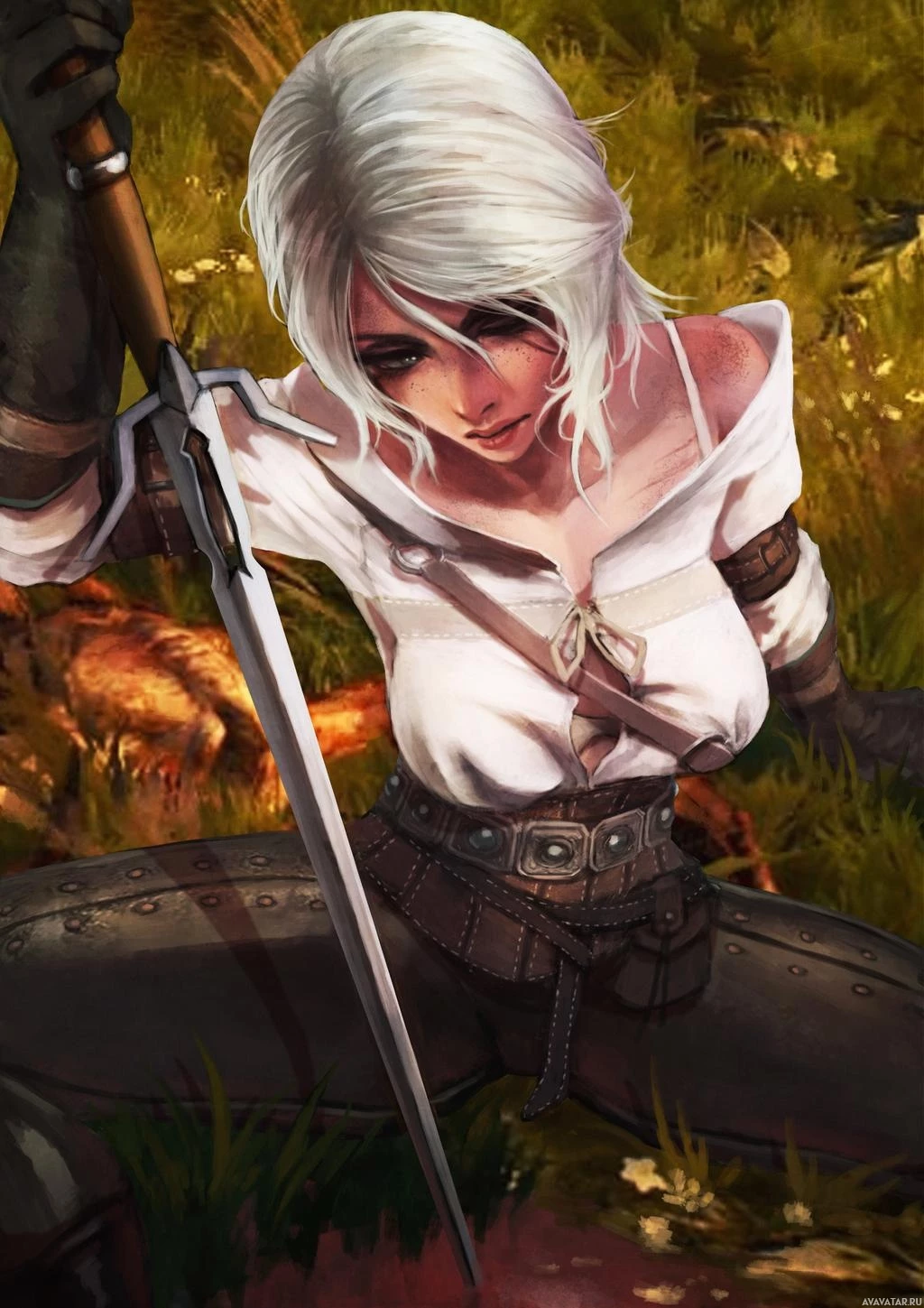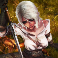 the video game "The Witcher 3: Wild Hunt," known as Ciri. She is depicted in an action pose with a sword, which suggests she might be