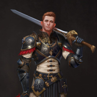 intricate designs, pauldrons (shoulder guards), and a gauntlet on one hand. The character also holds a sword in his other hand. His outfit has a red sash or belt across the torso, which is often associated with a military rank or status in