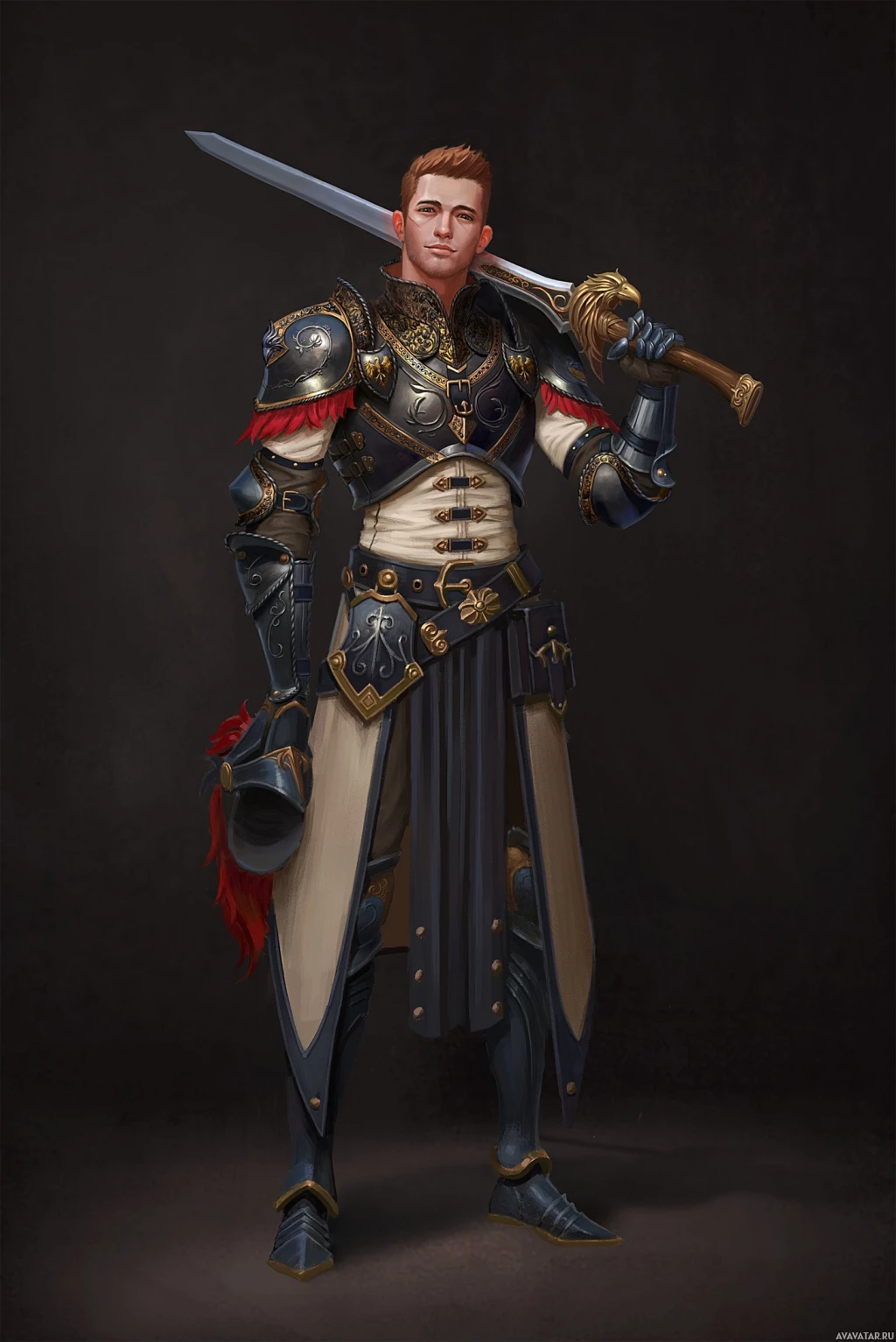 a male character dressed as a warrior from what appears to be a fantasy or historical setting. He is wearing a full suit of armor, which includes a helmet with a plume and crest, a breastplate with