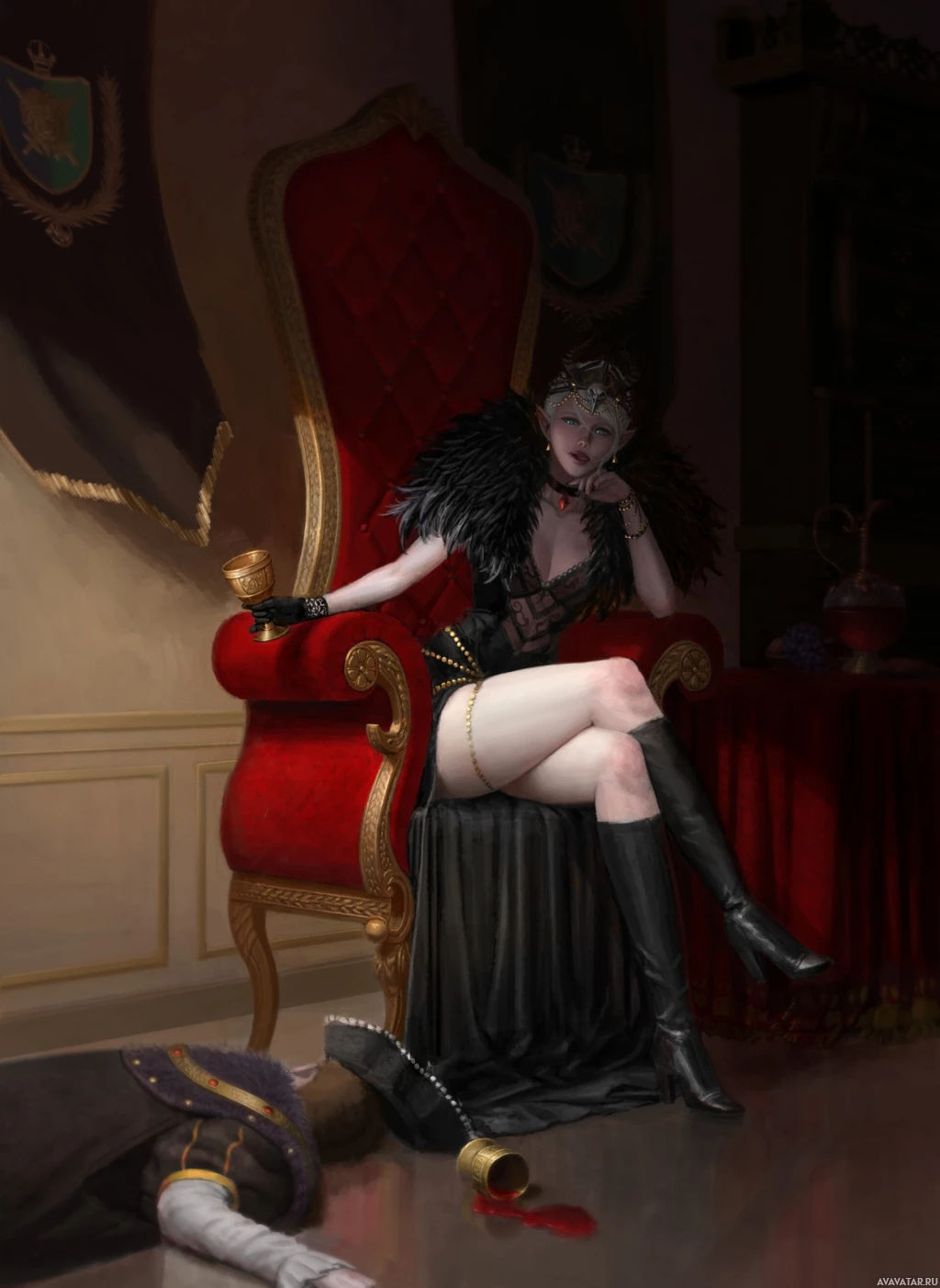 leather attire and boots with feathers on them. She has a serious or contemplative expression and is seated on a throne that is richly decorated with red cushions and gold accents, suggesting royalty or a position of power within