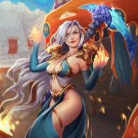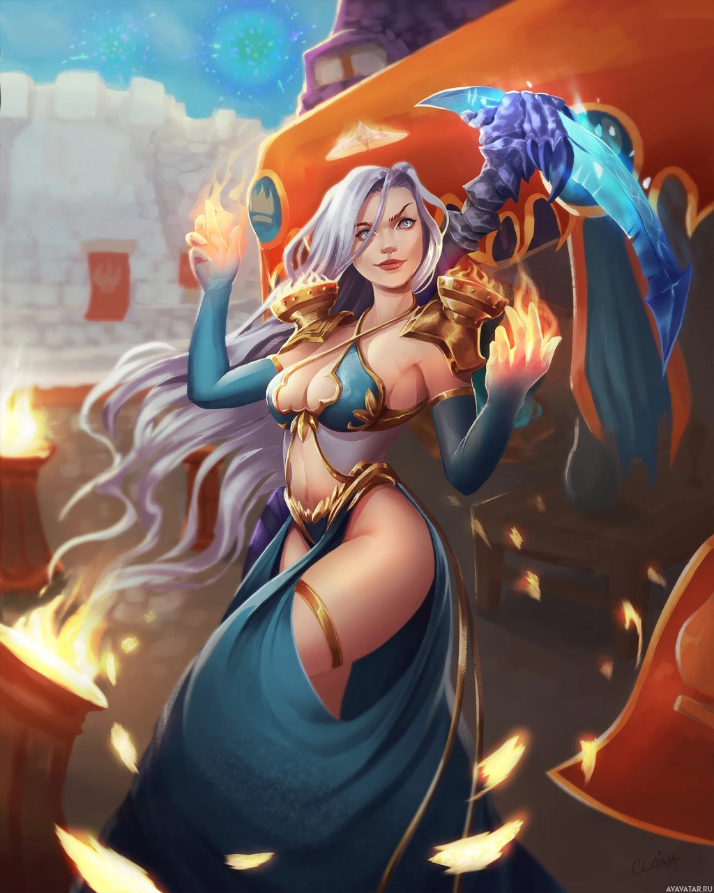 the magical flames surrounding her hand. There are also some elements in the background that resemble