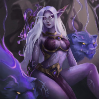 white hair, pointed ears, and is wearing a purple dress with a skirt that resembles flames, suggesting a magical or powerful theme. She is accompanied by two cat-like creatures, one blue and one purple, which might be interpreted as