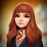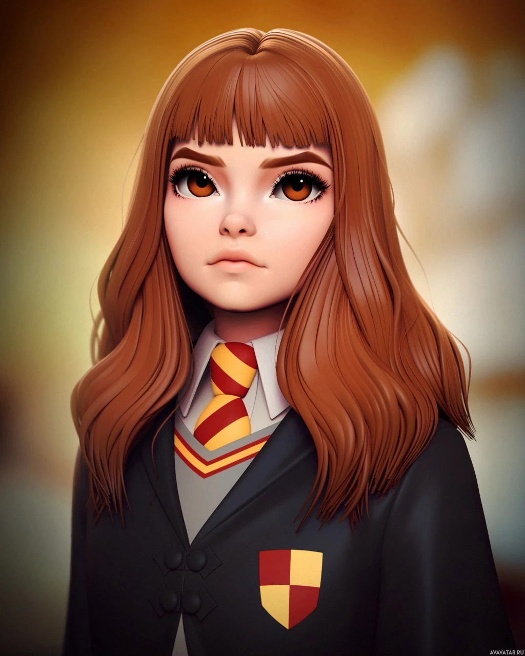 Это цифровая иллюстрация персонажа, который, по-видимому, является Гермионой Грейнджер из серии "Гарри Поттер". На ней надета мантия Хогвартса, которая включает в себя форму Гриффиндора с гербом распределяющей шляпы на груди и волшебной палочкой в руке. Ее волосы уложены в короткую прическу, а на лице - внимательное выражение.