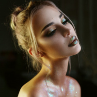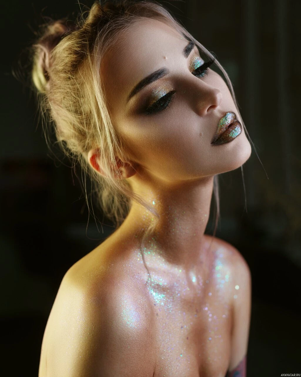 long hair and is wearing makeup that includes what appears to be dark lipstick or lip gloss. There are small sparkles or shimmer on her skin, which could indicate some form of glittery or textured