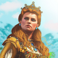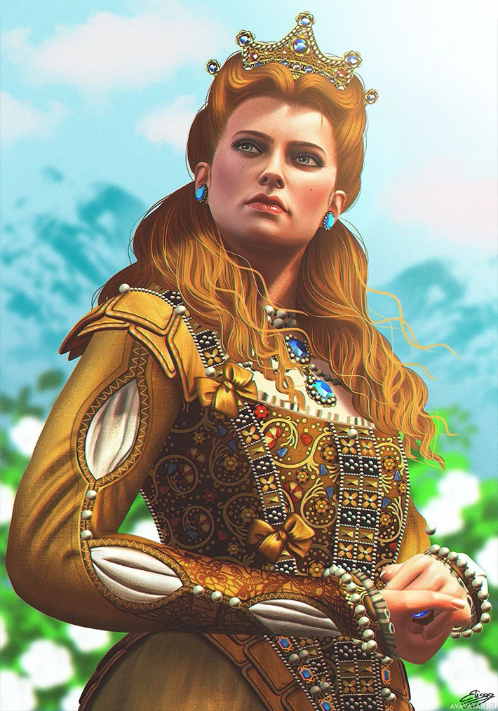 The image depicts a woman dressed in a medieval-style costume with