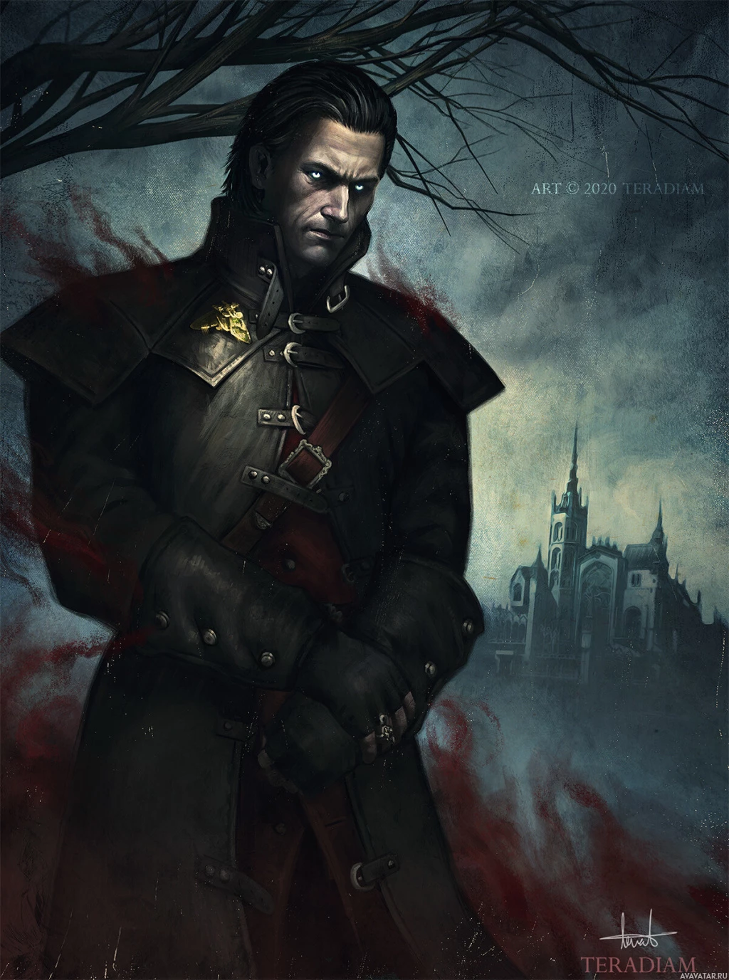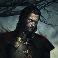 period attire with elements that suggest nobility or perhaps a military background, as suggested by the medals on his uniform. The setting appears to be a dark,