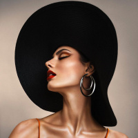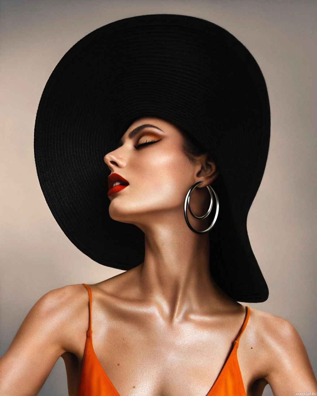 На картинке женщина позирует с закрытыми глазами и слегка склоненной набок головой. На ней большая круглая шляпа, закрывающая часть лица и плеч. У женщины гладкая, элегантная прическа, а также яркая красная помада, которая дополняет ее стильный образ. На ней оранжевый топ на тонких бретельках.