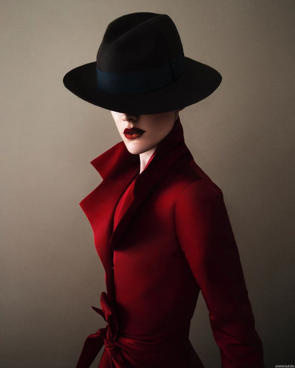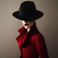 brimmed hat and a red coat with a peaked collar. The individual is also dressed in a garment that appears to be a dress or jacket of the same color. They have a strong,