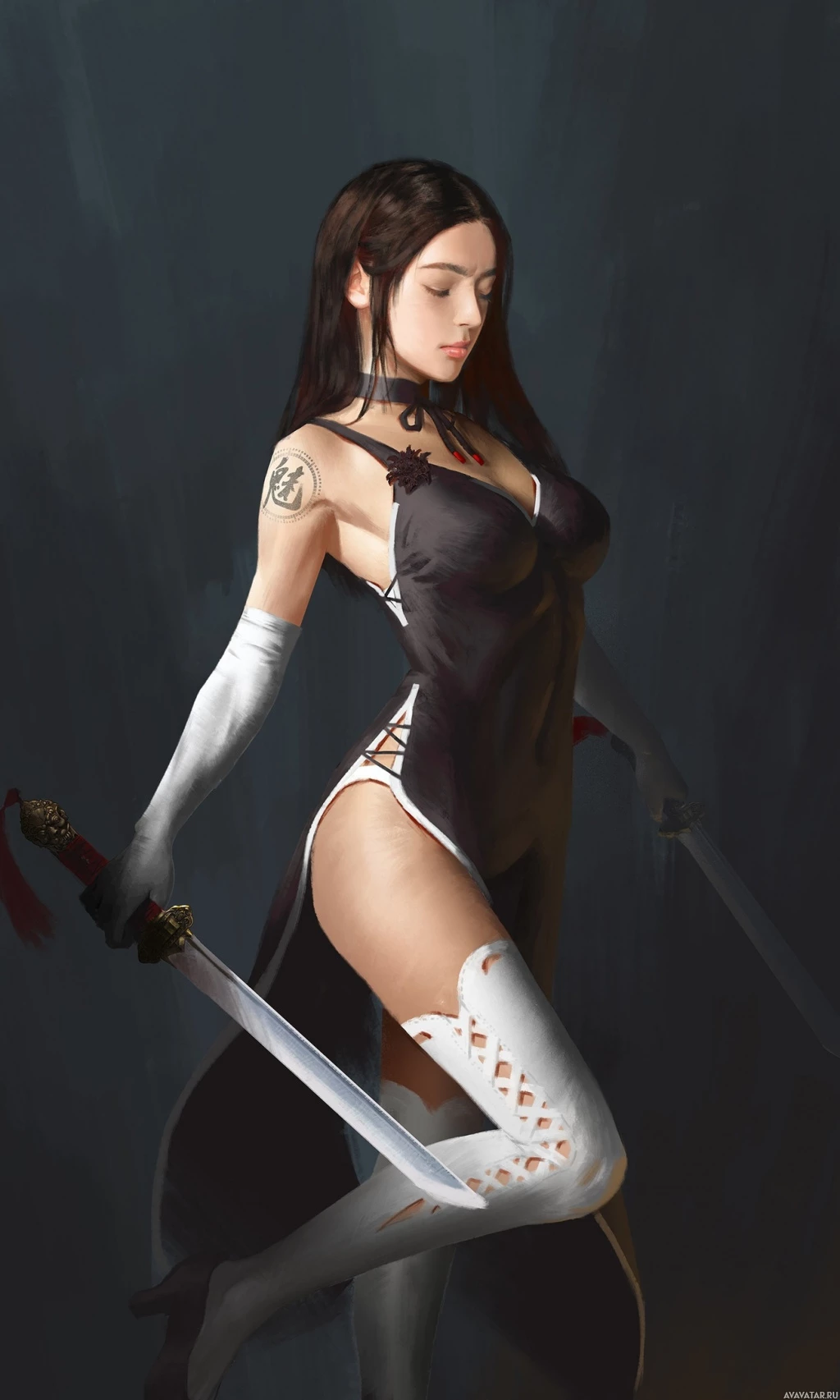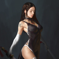 warrior attire. In her hands, she is holding a sword and a shield, suggesting that she might be a warrior or a fighter in the context of this illustration. The character has closed eyes and seems to be posing for the image with a contemplative or focused expression.