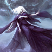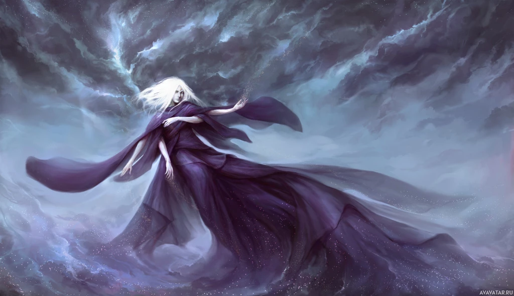 an ethereal figure, possibly a witch or sorceress, set against a stormy sky filled with clouds and stars. Her attire is flowing and elegant, suggesting a connection to nature or