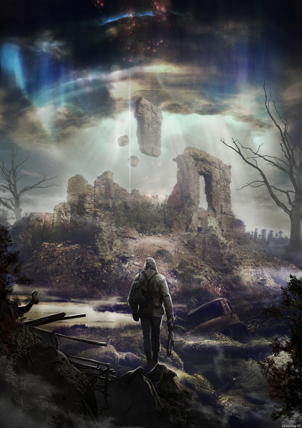 a hooded figure standing on a rocky terrain with a weapon in their hand. They are facing away from the viewer, looking towards a destroyed village or ruins with crumbling buildings that suggest a war-
