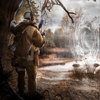 a natural environment that appears to be an abandoned or post-apocalyptic setting. This individual is holding what appears to be a rifle or firearm, suggesting they might be part of a hunting or survival situation. The artwork style suggests it could be related to the "Stalker" series of