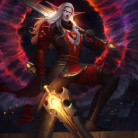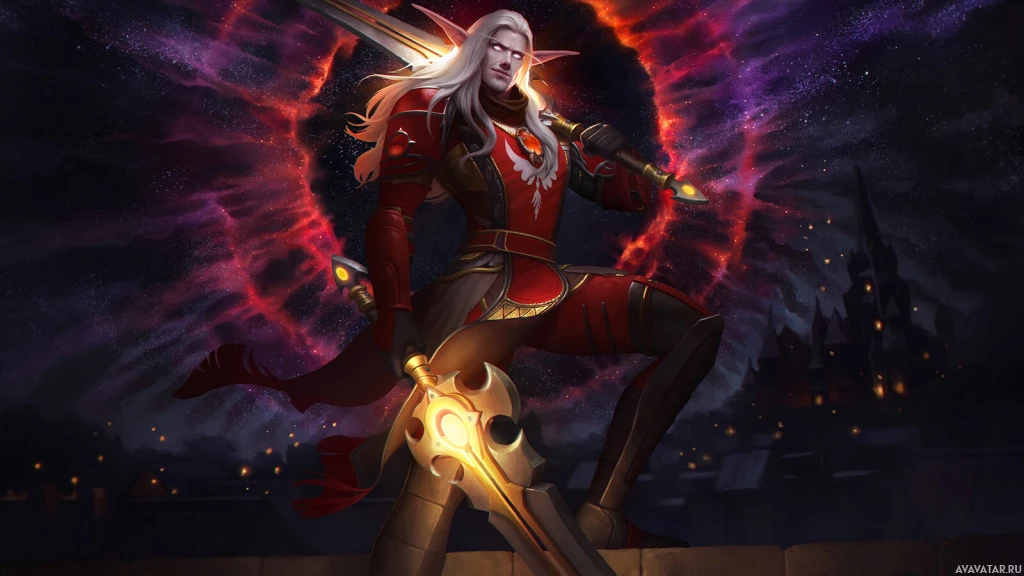 white hair, wielding a sword, and sitting on what appears to be a throne or a high platform. The background features swirling purple and red energies or possibly flames, suggesting a magical or intense environment.