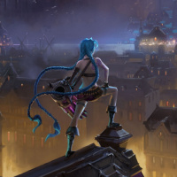 various lights illuminating the buildings and streets below. Jinx has distinctive spiky blue hair and is dressed in a purple top and black pants, which are typical of her