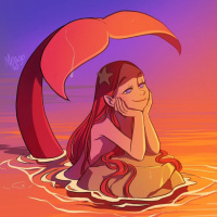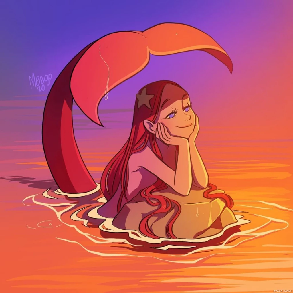 red hair, sitting under the shade of a pink umbrella while floating on water. This character appears to be a mermaid or