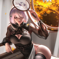 the video game "Nier: Automata." The character depicted appears to be a female with pale skin and short
