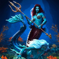 the ocean floor, holding what appears to be a trident or staff in her hand. She has aquatic features such as