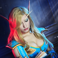 blonde hair, wearing a colorful outfit with blue and gold accents, which suggests a magical or enchanted theme. She has her eyes closed, giving