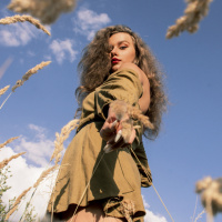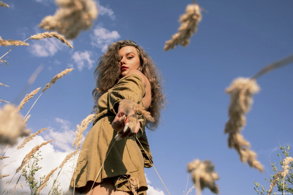 tall grass or grain, possibly during harvest season given the golden color of the foliage. The individual is wearing a costume that seems inspired by historical or fantasy elements, with a dress and hat that have a vintage or