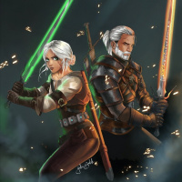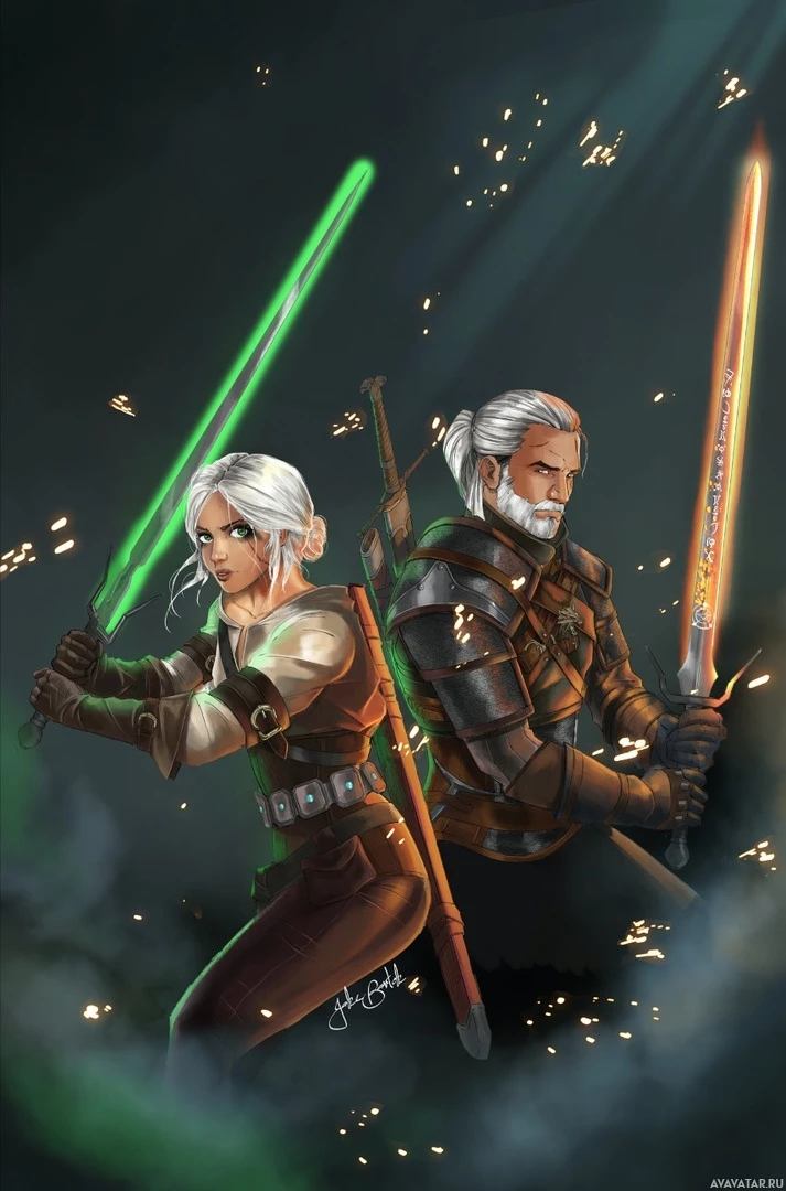 Wild Hunt," a popular action role-playing game. On the left is Ciri, portrayed by actress Freya Allan, and on the right is
